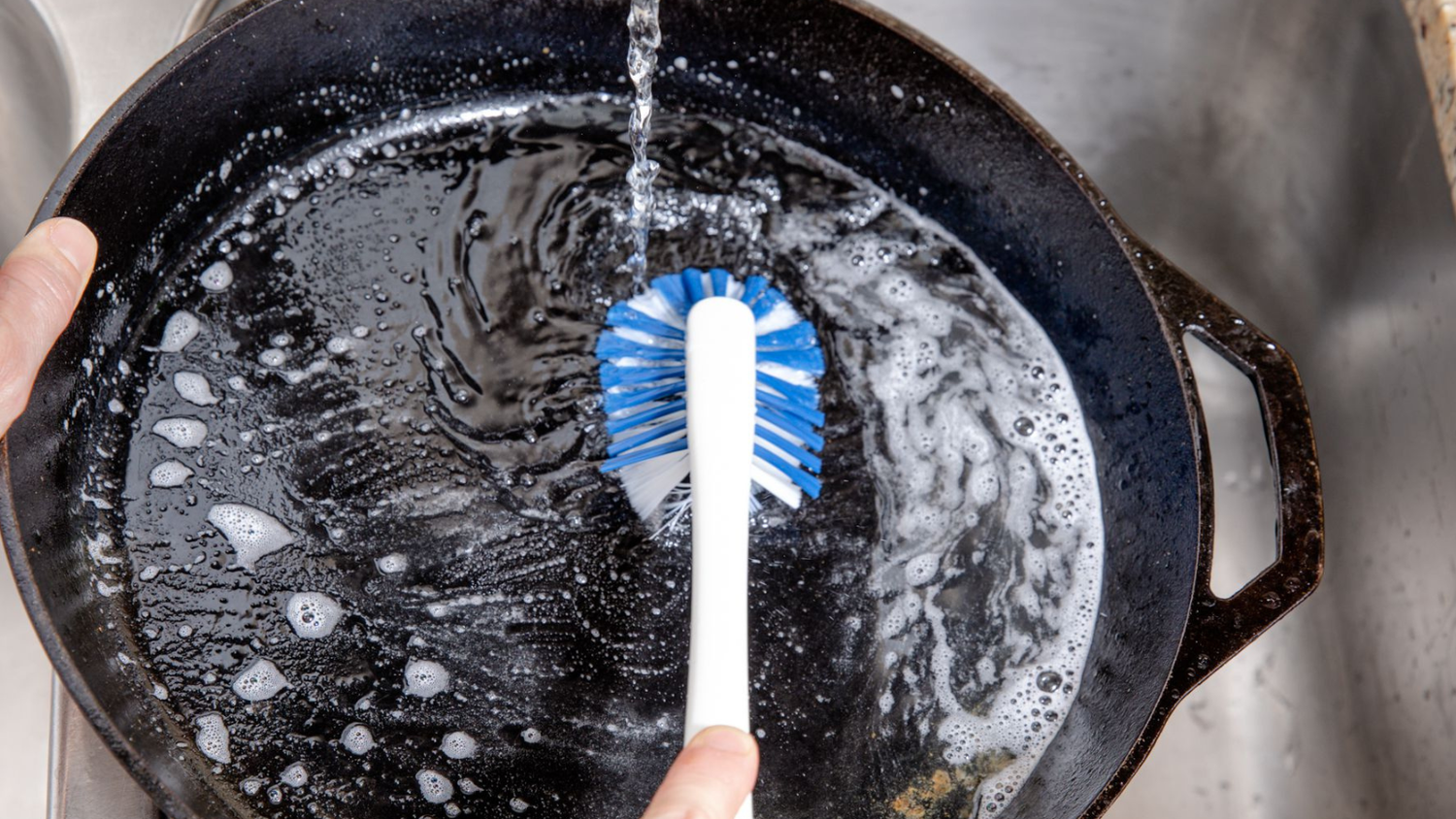 For the best and easiest results when cleaning your cast iron, tackle the tidy-up mission while the skillet is still warm from cooking your meal. For a complete how-to, check out our step-by-step guide for cleaning cast iron.