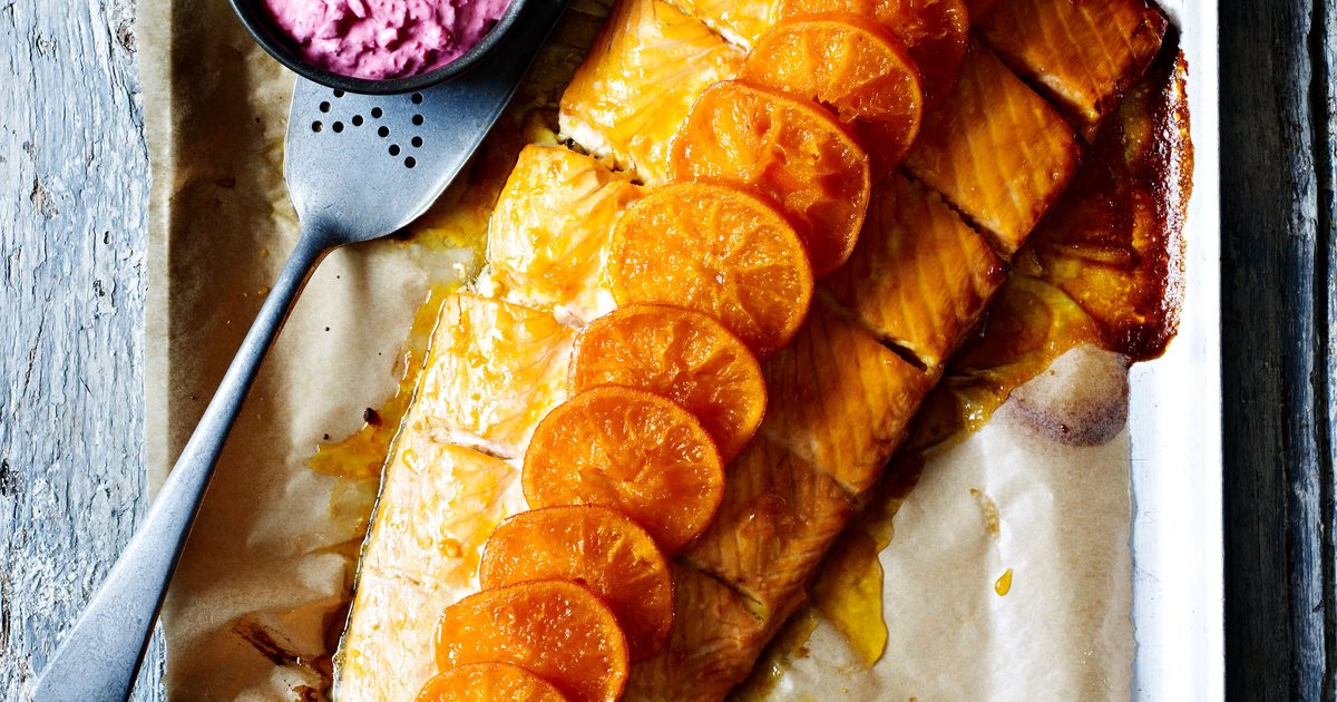 Clementine & vodka-baked salmon with beetroot crème fraîche sauce (Ready in 1 hour)