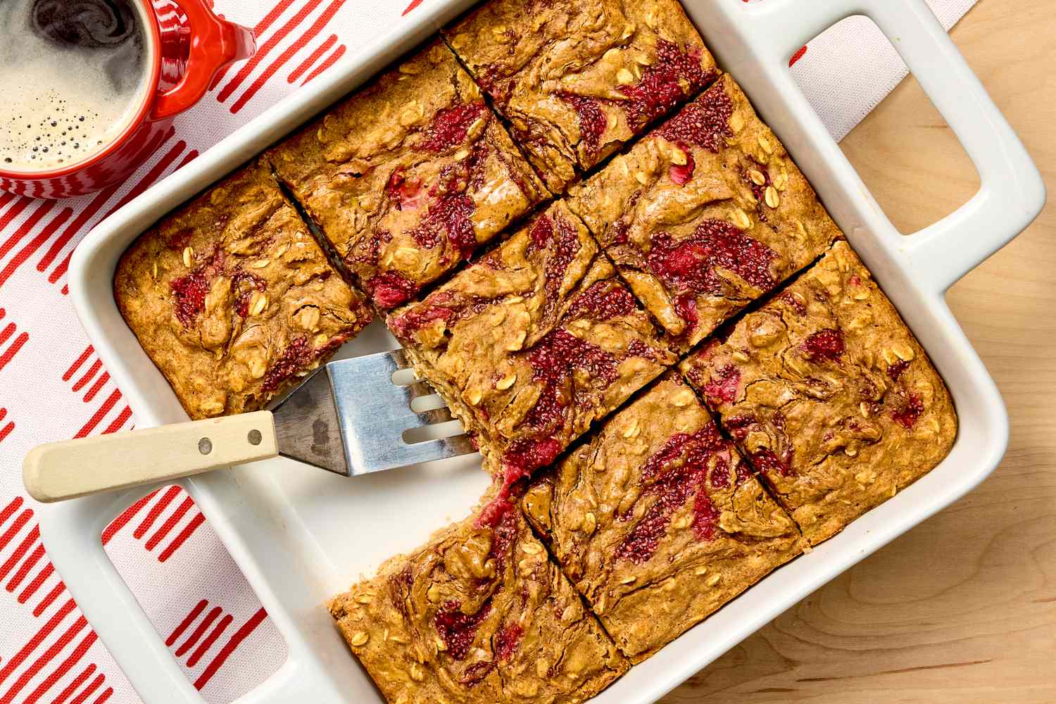 These high-protein almond butter–strawberry oatmeal bars are a make-ahead option for busy mornings or afternoon snacks. Mashed bananas and strawberries naturally sweeten the bars, while almond butter and yogurt add protein and richness. Finished with a jammy strawberry swirl, these soft-baked oatmeal bars strike the perfect balance between comforting and energizing.