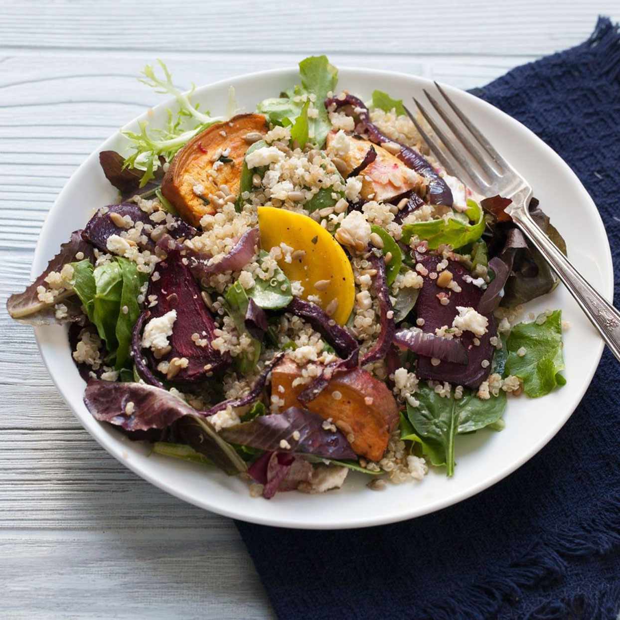 2 cups mixed greens + 1 cup roasted veggies + ½ cup quinoa + 1 Tbsp. crumbled feta + 1 Tbsp. sunflower seeds + 1-2 Tbsp. vinaigrette