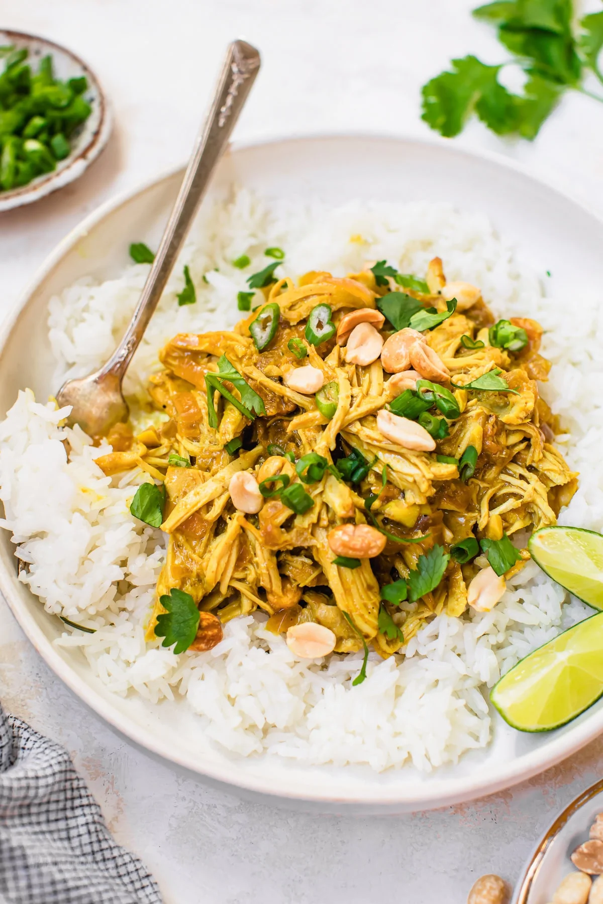 This easy Slow Cooker Thai-Inspired Peanut Chicken simmers in a creamy peanut-coconut sauce with lime, ginger, garlic, and curry spices. It’s high-protein and family-friendly.